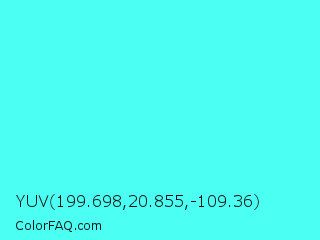 YUV 199.698,20.855,-109.36 Color is a light cyan color and the nearest color is Turquoise #40e0d0. Hex code #4bfff2 and RGB value is rgb(75,255,242). In RGB color space, this color is composed of 29% red, 100% green, 95% blue, In CMYK color space, this color is composed of 71% cyan, 0% magenta, 5% yellow , 0% black , In HSL color space, this color has a hue angle of 176° , 100% saturation and 65% lightness.