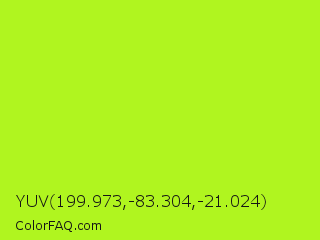 YUV 199.973,-83.304,-21.024 Color is a normal lime color and the nearest color is Green Yellow #adff2f. Hex code #b0f51f and RGB value is rgb(176,245,31). In RGB color space, this color is composed of 69% red, 96% green, 12% blue, In CMYK color space, this color is composed of 28% cyan, 0% magenta, 87% yellow , 4% black , In HSL color space, this color has a hue angle of 79° , 91% saturation and 54% lightness.