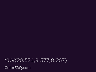 YUV 20.574,9.577,8.267 Color is a very dark purple color and the nearest color is Haiti #1b1035. Hex code #1e0c28 and RGB value is rgb(30,12,40). In RGB color space, this color is composed of 12% red, 5% green, 16% blue, In CMYK color space, this color is composed of 25% cyan, 70% magenta, 0% yellow , 84% black , In HSL color space, this color has a hue angle of 279° , 54% saturation and 10% lightness.