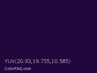 YUV 20.93,19.755,10.585 Color is a very dark violet color and the nearest color is Violet #240a40. Hex code #21073d and RGB value is rgb(33,7,61). In RGB color space, this color is composed of 13% red, 3% green, 24% blue, In CMYK color space, this color is composed of 46% cyan, 89% magenta, 0% yellow , 76% black , In HSL color space, this color has a hue angle of 269° , 79% saturation and 13% lightness.