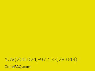 YUV 200.024,-97.133,28.043 Color is a normal yellow color and the nearest color is Peridot #e6e200. Hex code #e8de03 and RGB value is rgb(232,222,3). In RGB color space, this color is composed of 91% red, 87% green, 1% blue, In CMYK color space, this color is composed of 0% cyan, 4% magenta, 99% yellow , 9% black , In HSL color space, this color has a hue angle of 57° , 97% saturation and 46% lightness.