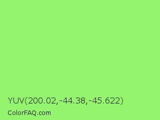 YUV 200.02,-44.38,-45.622 Color is a light green color and the nearest color is Light Green #90ee90. Hex code #94f46e and RGB value is rgb(148,244,110). In RGB color space, this color is composed of 58% red, 96% green, 43% blue, In CMYK color space, this color is composed of 39% cyan, 0% magenta, 55% yellow , 4% black , In HSL color space, this color has a hue angle of 103° , 86% saturation and 69% lightness.
