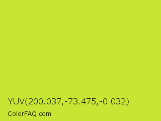 YUV 200.037,-73.475,-0.032 Color is a normal yellow color and the nearest color is Pear #d1e231. Hex code #c8e533 and RGB value is rgb(200,229,51). In RGB color space, this color is composed of 78% red, 90% green, 20% blue, In CMYK color space, this color is composed of 13% cyan, 0% magenta, 78% yellow , 10% black , In HSL color space, this color has a hue angle of 70° , 77% saturation and 55% lightness.
