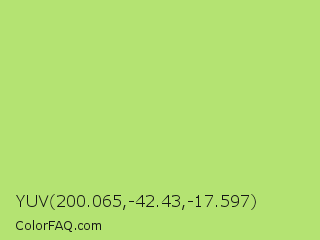 YUV 200.065,-42.43,-17.597 Color is a light green color and the nearest color is Yellow Green #c5e17a. Hex code #b4e372 and RGB value is rgb(180,227,114). In RGB color space, this color is composed of 71% red, 89% green, 45% blue, In CMYK color space, this color is composed of 21% cyan, 0% magenta, 50% yellow , 11% black , In HSL color space, this color has a hue angle of 85° , 67% saturation and 67% lightness.
