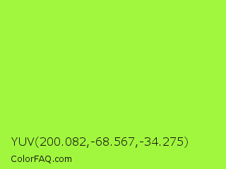YUV 200.082,-68.567,-34.275 Color is a normal green color and the nearest color is French Lime #9efd38. Hex code #a1f73d and RGB value is rgb(161,247,61). In RGB color space, this color is composed of 63% red, 97% green, 24% blue, In CMYK color space, this color is composed of 35% cyan, 0% magenta, 75% yellow , 3% black , In HSL color space, this color has a hue angle of 88° , 92% saturation and 60% lightness.