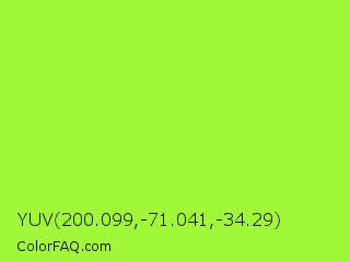 YUV 200.099,-71.041,-34.29 Color is a normal green color and the nearest color is French Lime #9efd38. Hex code #a1f838 and RGB value is rgb(161,248,56). In RGB color space, this color is composed of 63% red, 97% green, 22% blue, In CMYK color space, this color is composed of 35% cyan, 0% magenta, 77% yellow , 3% black , In HSL color space, this color has a hue angle of 87° , 93% saturation and 60% lightness.
