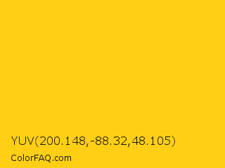 YUV 200.148,-88.32,48.105 Color is a normal yellow color and the nearest color is Candlelight #fcd917. Hex code #ffcf15 and RGB value is rgb(255,207,21). In RGB color space, this color is composed of 100% red, 81% green, 8% blue, In CMYK color space, this color is composed of 0% cyan, 19% magenta, 92% yellow , 0% black , In HSL color space, this color has a hue angle of 48° , 100% saturation and 54% lightness.
