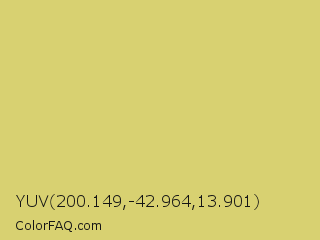 YUV 200.149,-42.964,13.901 Color is a light yellow color and the nearest color is Chenin #dfcd6f. Hex code #d8d171 and RGB value is rgb(216,209,113). In RGB color space, this color is composed of 85% red, 82% green, 44% blue, In CMYK color space, this color is composed of 0% cyan, 3% magenta, 48% yellow , 15% black , In HSL color space, this color has a hue angle of 56° , 57% saturation and 65% lightness.