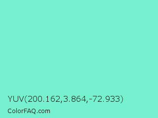 YUV 200.162,3.864,-72.933 Color is a light cyan color and the nearest color is Aquamarine #7fffd4. Hex code #75f1d0 and RGB value is rgb(117,241,208). In RGB color space, this color is composed of 46% red, 95% green, 82% blue, In CMYK color space, this color is composed of 51% cyan, 0% magenta, 14% yellow , 5% black , In HSL color space, this color has a hue angle of 164° , 82% saturation and 70% lightness.