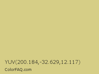 YUV 200.184,-32.629,12.117 Color is a light yellow color and the nearest color is Winter Hazel #d5d195. Hex code #d6ce86 and RGB value is rgb(214,206,134). In RGB color space, this color is composed of 84% red, 81% green, 53% blue, In CMYK color space, this color is composed of 0% cyan, 4% magenta, 37% yellow , 16% black , In HSL color space, this color has a hue angle of 54° , 49% saturation and 68% lightness.