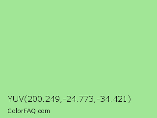 YUV 200.249,-24.773,-34.421 Color is a light green color and the nearest color is Granny Smith Apple Crayola #9de093. Hex code #a1e696 and RGB value is rgb(161,230,150). In RGB color space, this color is composed of 63% red, 90% green, 59% blue, In CMYK color space, this color is composed of 30% cyan, 0% magenta, 35% yellow , 10% black , In HSL color space, this color has a hue angle of 112° , 62% saturation and 75% lightness.