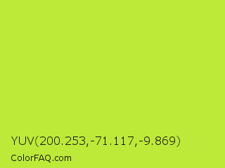 YUV 200.253,-71.117,-9.869 Color is a normal lime color and the nearest color is Pear #d1e231. Hex code #bdea38 and RGB value is rgb(189,234,56). In RGB color space, this color is composed of 74% red, 92% green, 22% blue, In CMYK color space, this color is composed of 19% cyan, 0% magenta, 76% yellow , 8% black , In HSL color space, this color has a hue angle of 75° , 81% saturation and 57% lightness.