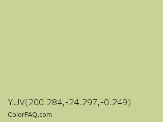YUV 200.284,-24.297,-0.249 Color is a light yellow color and the nearest color is Pine Glade #c7cd90. Hex code #c8d297 and RGB value is rgb(200,210,151). In RGB color space, this color is composed of 78% red, 82% green, 59% blue, In CMYK color space, this color is composed of 5% cyan, 0% magenta, 28% yellow , 18% black , In HSL color space, this color has a hue angle of 70° , 40% saturation and 71% lightness.