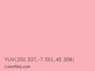 YUV 200.337,-7.561,45.308 Color is a very light red color and the nearest color is Sundown #ffb1b3. Hex code #fcb1b9 and RGB value is rgb(252,177,185). In RGB color space, this color is composed of 99% red, 69% green, 73% blue, In CMYK color space, this color is composed of 0% cyan, 30% magenta, 27% yellow , 1% black , In HSL color space, this color has a hue angle of 354° , 93% saturation and 84% lightness.