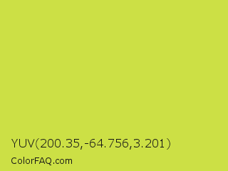 YUV 200.35,-64.756,3.201 Color is a normal yellow color and the nearest color is Maximum Green Yellow #d9e650. Hex code #cce045 and RGB value is rgb(204,224,69). In RGB color space, this color is composed of 80% red, 88% green, 27% blue, In CMYK color space, this color is composed of 9% cyan, 0% magenta, 69% yellow , 12% black , In HSL color space, this color has a hue angle of 68° , 71% saturation and 57% lightness.