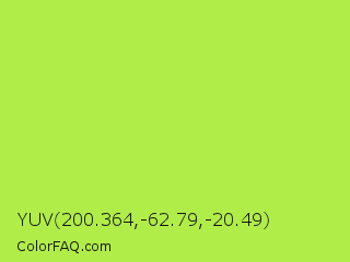 YUV 200.364,-62.79,-20.49 Color is a light green color and the nearest color is Conifer #acdd4d. Hex code #b1ed49 and RGB value is rgb(177,237,73). In RGB color space, this color is composed of 69% red, 93% green, 29% blue, In CMYK color space, this color is composed of 25% cyan, 0% magenta, 69% yellow , 7% black , In HSL color space, this color has a hue angle of 82° , 82% saturation and 61% lightness.