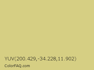 YUV 200.429,-34.228,11.902 Color is a light yellow color and the nearest color is Winter Hazel #d5d195. Hex code #d6cf83 and RGB value is rgb(214,207,131). In RGB color space, this color is composed of 84% red, 81% green, 51% blue, In CMYK color space, this color is composed of 0% cyan, 3% magenta, 39% yellow , 16% black , In HSL color space, this color has a hue angle of 55° , 50% saturation and 68% lightness.