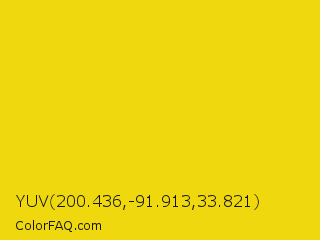 YUV 200.436,-91.913,33.821 Color is a normal yellow color and the nearest color is Safety Yellow #eed202. Hex code #efd90e and RGB value is rgb(239,217,14). In RGB color space, this color is composed of 94% red, 85% green, 5% blue, In CMYK color space, this color is composed of 0% cyan, 9% magenta, 94% yellow , 6% black , In HSL color space, this color has a hue angle of 54° , 89% saturation and 50% lightness.