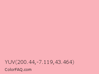 YUV 200.44,-7.119,43.464 Color is a very light red color and the nearest color is Sundown #ffb1b3. Hex code #fab2ba and RGB value is rgb(250,178,186). In RGB color space, this color is composed of 98% red, 70% green, 73% blue, In CMYK color space, this color is composed of 0% cyan, 29% magenta, 26% yellow , 2% black , In HSL color space, this color has a hue angle of 353° , 88% saturation and 84% lightness.