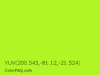 YUV 200.543,-81.12,-21.524 Color is a normal green color and the nearest color is Green Yellow #adff2f. Hex code #b0f524 and RGB value is rgb(176,245,36). In RGB color space, this color is composed of 69% red, 96% green, 14% blue, In CMYK color space, this color is composed of 28% cyan, 0% magenta, 85% yellow , 4% black , In HSL color space, this color has a hue angle of 80° , 91% saturation and 55% lightness.