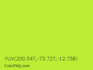 YUV 200.547,-73.727,-12.758 Color is a normal lime color and the nearest color is Green Lizard #a7f432. Hex code #baed33 and RGB value is rgb(186,237,51). In RGB color space, this color is composed of 73% red, 93% green, 20% blue, In CMYK color space, this color is composed of 22% cyan, 0% magenta, 78% yellow , 7% black , In HSL color space, this color has a hue angle of 76° , 84% saturation and 56% lightness.