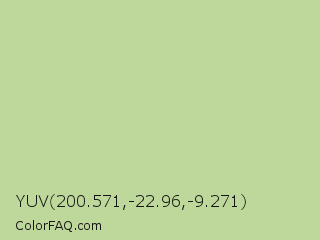 YUV 200.571,-22.96,-9.271 Color is a light green color and the nearest color is Pine Glade #c7cd90. Hex code #bed79a and RGB value is rgb(190,215,154). In RGB color space, this color is composed of 75% red, 84% green, 60% blue, In CMYK color space, this color is composed of 12% cyan, 0% magenta, 28% yellow , 16% black , In HSL color space, this color has a hue angle of 85° , 43% saturation and 72% lightness.