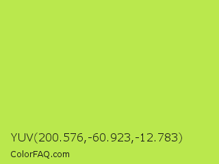 YUV 200.576,-60.923,-12.783 Color is a light lime color and the nearest color is June Bud #bdda57. Hex code #bae84d and RGB value is rgb(186,232,77). In RGB color space, this color is composed of 73% red, 91% green, 30% blue, In CMYK color space, this color is composed of 20% cyan, 0% magenta, 67% yellow , 9% black , In HSL color space, this color has a hue angle of 78° , 77% saturation and 61% lightness.