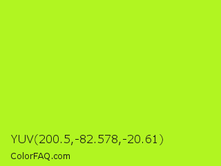 YUV 200.5,-82.578,-20.61 Color is a normal lime color and the nearest color is Green Yellow #adff2f. Hex code #b1f521 and RGB value is rgb(177,245,33). In RGB color space, this color is composed of 69% red, 96% green, 13% blue, In CMYK color space, this color is composed of 28% cyan, 0% magenta, 87% yellow , 4% black , In HSL color space, this color has a hue angle of 79° , 91% saturation and 55% lightness.