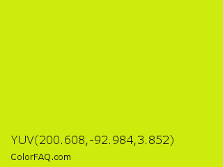 YUV 200.608,-92.984,3.852 Color is a normal yellow color and the nearest color is Las Palmas #c6e610. Hex code #cdeb0c and RGB value is rgb(205,235,12). In RGB color space, this color is composed of 80% red, 92% green, 5% blue, In CMYK color space, this color is composed of 13% cyan, 0% magenta, 95% yellow , 8% black , In HSL color space, this color has a hue angle of 68° , 90% saturation and 48% lightness.
