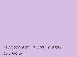YUV 200.622,13.497,10.856 Color is a very light purple color and the nearest color is Prelude #d0c0e5. Hex code #d5bde4 and RGB value is rgb(213,189,228). In RGB color space, this color is composed of 84% red, 74% green, 89% blue, In CMYK color space, this color is composed of 7% cyan, 17% magenta, 0% yellow , 11% black , In HSL color space, this color has a hue angle of 277° , 42% saturation and 82% lightness.