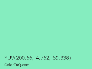 YUV 200.66,-4.762,-59.338 Color is a light green color and the nearest color is Algae Green #93dfb8. Hex code #85edbf and RGB value is rgb(133,237,191). In RGB color space, this color is composed of 52% red, 93% green, 75% blue, In CMYK color space, this color is composed of 44% cyan, 0% magenta, 19% yellow , 7% black , In HSL color space, this color has a hue angle of 153° , 74% saturation and 73% lightness.