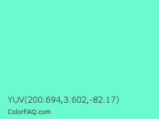 YUV 200.694,3.602,-82.17 Color is a light green color and the nearest color is Aquamarine #7fffd4. Hex code #6bf7d0 and RGB value is rgb(107,247,208). In RGB color space, this color is composed of 42% red, 97% green, 82% blue, In CMYK color space, this color is composed of 57% cyan, 0% magenta, 16% yellow , 3% black , In HSL color space, this color has a hue angle of 163° , 90% saturation and 69% lightness.