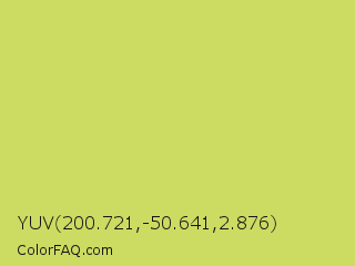 YUV 200.721,-50.641,2.876 Color is a light yellow color and the nearest color is June Bud #bdda57. Hex code #ccdb62 and RGB value is rgb(204,219,98). In RGB color space, this color is composed of 80% red, 86% green, 38% blue, In CMYK color space, this color is composed of 7% cyan, 0% magenta, 55% yellow , 14% black , In HSL color space, this color has a hue angle of 67° , 63% saturation and 62% lightness.