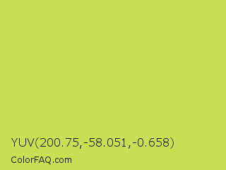 YUV 200.75,-58.051,-0.658 Color is a normal yellow color and the nearest color is June Bud #bdda57. Hex code #c8e053 and RGB value is rgb(200,224,83). In RGB color space, this color is composed of 78% red, 88% green, 33% blue, In CMYK color space, this color is composed of 11% cyan, 0% magenta, 63% yellow , 12% black , In HSL color space, this color has a hue angle of 70° , 69% saturation and 60% lightness.