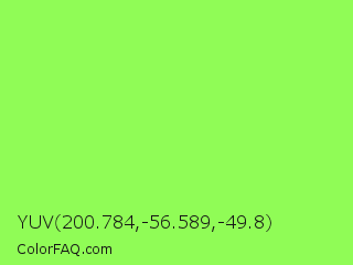 YUV 200.784,-56.589,-49.8 Color is a light green color and the nearest color is Kiwi #8ee53f. Hex code #90fc56 and RGB value is rgb(144,252,86). In RGB color space, this color is composed of 56% red, 99% green, 34% blue, In CMYK color space, this color is composed of 43% cyan, 0% magenta, 66% yellow , 1% black , In HSL color space, this color has a hue angle of 99° , 97% saturation and 66% lightness.