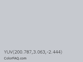 YUV 200.787,3.063,-2.444 Color is a light blue color and the nearest color is Ghost #c7c9d5. Hex code #c6c9cf and RGB value is rgb(198,201,207). In RGB color space, this color is composed of 78% red, 79% green, 81% blue, In CMYK color space, this color is composed of 4% cyan, 3% magenta, 0% yellow , 19% black , In HSL color space, this color has a hue angle of 220° , 9% saturation and 79% lightness.