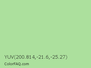 YUV 200.814,-21.6,-25.27 Color is a light green color and the nearest color is Granny Smith Apple #a8e4a0. Hex code #ace09d and RGB value is rgb(172,224,157). In RGB color space, this color is composed of 67% red, 88% green, 62% blue, In CMYK color space, this color is composed of 23% cyan, 0% magenta, 30% yellow , 12% black , In HSL color space, this color has a hue angle of 107° , 52% saturation and 75% lightness.