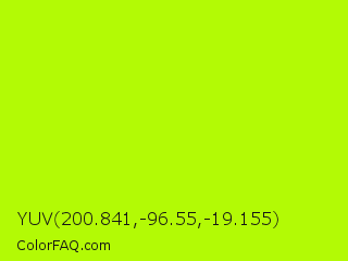 YUV 200.841,-96.55,-19.155 Color is a normal lime color and the nearest color is Spring Bud #a7fc00. Hex code #b3fa05 and RGB value is rgb(179,250,5). In RGB color space, this color is composed of 70% red, 98% green, 2% blue, In CMYK color space, this color is composed of 28% cyan, 0% magenta, 98% yellow , 2% black , In HSL color space, this color has a hue angle of 77° , 96% saturation and 50% lightness.