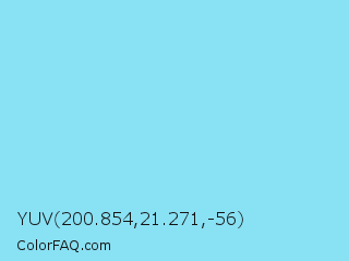 YUV 200.854,21.271,-56 Color is a light cyan color and the nearest color is Medium Sky Blue #80daeb. Hex code #89e1f4 and RGB value is rgb(137,225,244). In RGB color space, this color is composed of 54% red, 88% green, 96% blue, In CMYK color space, this color is composed of 44% cyan, 8% magenta, 0% yellow , 4% black , In HSL color space, this color has a hue angle of 191° , 83% saturation and 75% lightness.