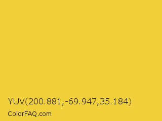 YUV 200.881,-69.947,35.184 Color is a normal yellow color and the nearest color is Sandstorm #ecd540. Hex code #f1d03b and RGB value is rgb(241,208,59). In RGB color space, this color is composed of 95% red, 82% green, 23% blue, In CMYK color space, this color is composed of 0% cyan, 14% magenta, 76% yellow , 5% black , In HSL color space, this color has a hue angle of 49° , 87% saturation and 59% lightness.