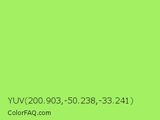 YUV 200.903,-50.238,-33.241 Color is a light green color and the nearest color is Inchworm #b2ec5d. Hex code #a3f063 and RGB value is rgb(163,240,99). In RGB color space, this color is composed of 64% red, 94% green, 39% blue, In CMYK color space, this color is composed of 32% cyan, 0% magenta, 59% yellow , 6% black , In HSL color space, this color has a hue angle of 93° , 82% saturation and 66% lightness.