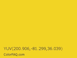 YUV 200.906,-81.299,36.039 Color is a normal yellow color and the nearest color is Ripe Lemon #f4d81c. Hex code #f2d424 and RGB value is rgb(242,212,36). In RGB color space, this color is composed of 95% red, 83% green, 14% blue, In CMYK color space, this color is composed of 0% cyan, 12% magenta, 85% yellow , 5% black , In HSL color space, this color has a hue angle of 51° , 89% saturation and 55% lightness.