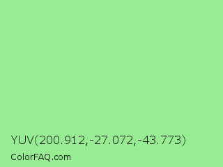 YUV 200.912,-27.072,-43.773 Color is a light green color and the nearest color is Light Green #90ee90. Hex code #97ed92 and RGB value is rgb(151,237,146). In RGB color space, this color is composed of 59% red, 93% green, 57% blue, In CMYK color space, this color is composed of 36% cyan, 0% magenta, 38% yellow , 7% black , In HSL color space, this color has a hue angle of 117° , 72% saturation and 75% lightness.
