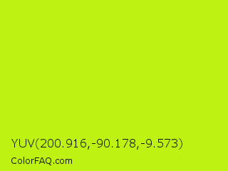 YUV 200.916,-90.178,-9.573 Color is a normal lime color and the nearest color is Las Palmas #c6e610. Hex code #bef212 and RGB value is rgb(190,242,18). In RGB color space, this color is composed of 75% red, 95% green, 7% blue, In CMYK color space, this color is composed of 21% cyan, 0% magenta, 93% yellow , 5% black , In HSL color space, this color has a hue angle of 74° , 90% saturation and 51% lightness.