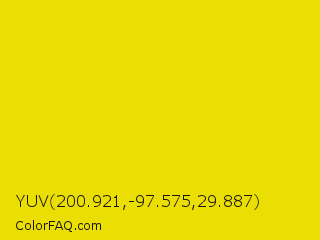 YUV 200.921,-97.575,29.887 Color is a normal yellow color and the nearest color is Peridot #e6e200. Hex code #ebde03 and RGB value is rgb(235,222,3). In RGB color space, this color is composed of 92% red, 87% green, 1% blue, In CMYK color space, this color is composed of 0% cyan, 6% magenta, 99% yellow , 8% black , In HSL color space, this color has a hue angle of 57° , 97% saturation and 47% lightness.