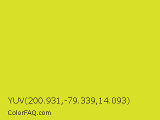 YUV 200.931,-79.339,14.093 Color is a normal yellow color and the nearest color is Pear #d1e231. Hex code #d9e028 and RGB value is rgb(217,224,40). In RGB color space, this color is composed of 85% red, 88% green, 16% blue, In CMYK color space, this color is composed of 3% cyan, 0% magenta, 82% yellow , 12% black , In HSL color space, this color has a hue angle of 62° , 75% saturation and 52% lightness.