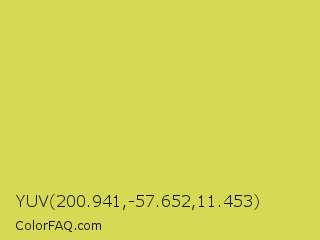 YUV 200.941,-57.652,11.453 Color is a normal yellow color and the nearest color is Maximum Green Yellow #d9e650. Hex code #d6d954 and RGB value is rgb(214,217,84). In RGB color space, this color is composed of 84% red, 85% green, 33% blue, In CMYK color space, this color is composed of 1% cyan, 0% magenta, 61% yellow , 15% black , In HSL color space, this color has a hue angle of 61° , 64% saturation and 59% lightness.