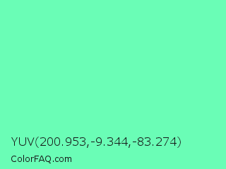 YUV 200.953,-9.344,-83.274 Color is a light green color and the nearest color is Medium Aquamarine #66ddaa. Hex code #6afdb6 and RGB value is rgb(106,253,182). In RGB color space, this color is composed of 42% red, 99% green, 71% blue, In CMYK color space, this color is composed of 58% cyan, 0% magenta, 28% yellow , 1% black , In HSL color space, this color has a hue angle of 151° , 97% saturation and 70% lightness.