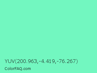YUV 200.963,-4.419,-76.267 Color is a light green color and the nearest color is Aquamarine #7fffd4. Hex code #72f7c0 and RGB value is rgb(114,247,192). In RGB color space, this color is composed of 45% red, 97% green, 75% blue, In CMYK color space, this color is composed of 54% cyan, 0% magenta, 22% yellow , 3% black , In HSL color space, this color has a hue angle of 155° , 89% saturation and 71% lightness.
