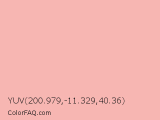 YUV 200.979,-11.329,40.36 Color is a very light red color and the nearest color is Melon #fdbcb4. Hex code #f7b6b2 and RGB value is rgb(247,182,178). In RGB color space, this color is composed of 97% red, 71% green, 70% blue, In CMYK color space, this color is composed of 0% cyan, 26% magenta, 28% yellow , 3% black , In HSL color space, this color has a hue angle of 3° , 81% saturation and 83% lightness.